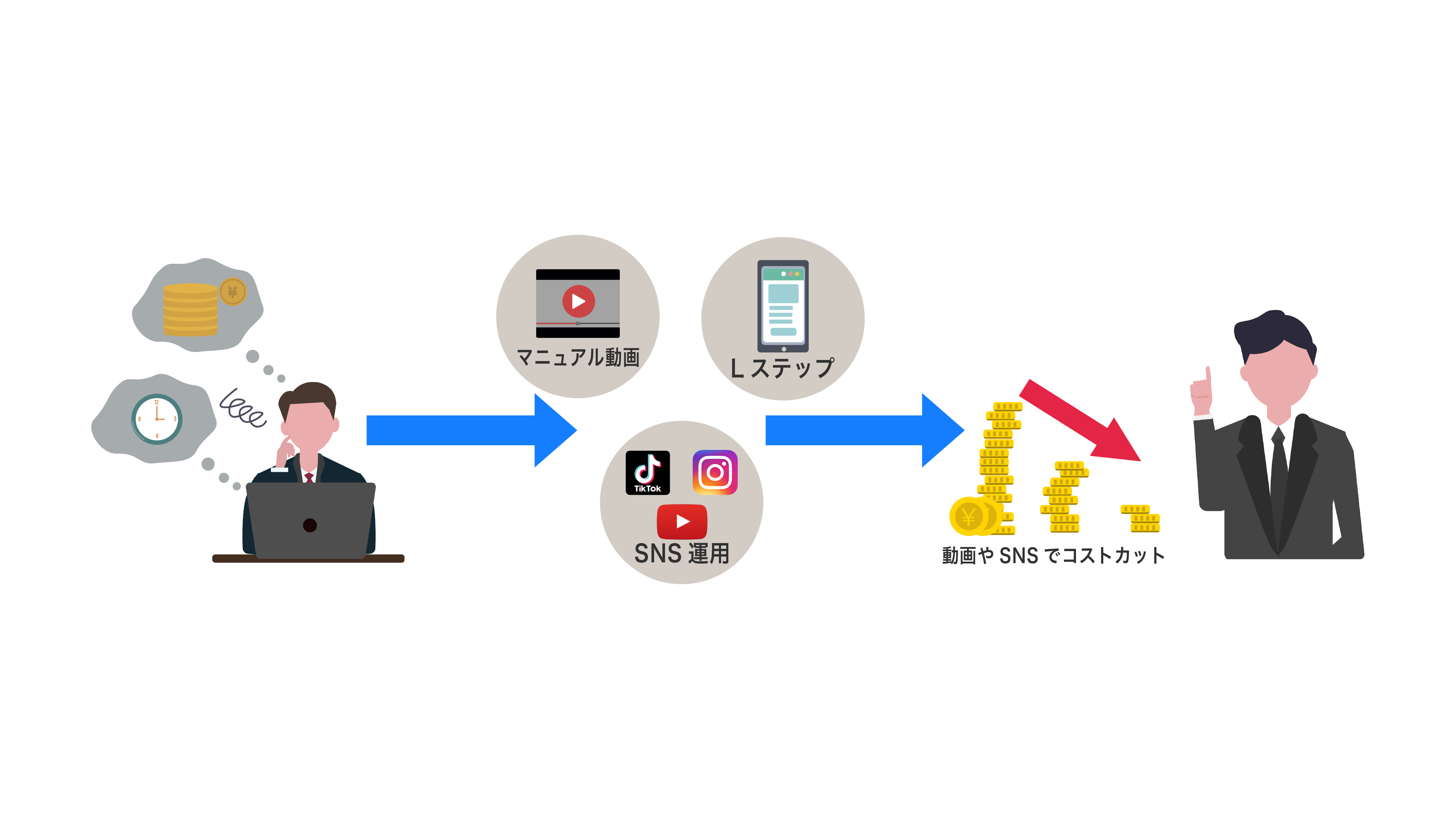 説明動画や工程動画などの作成、Lステップなどを用いた運用でコストを削減します。